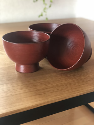 これは欅に蒔地という少しざらついた漆で仕上げてます。色は赤ですが使っていくうちに黒が出てきます。カタチは合鹿椀という脚高。